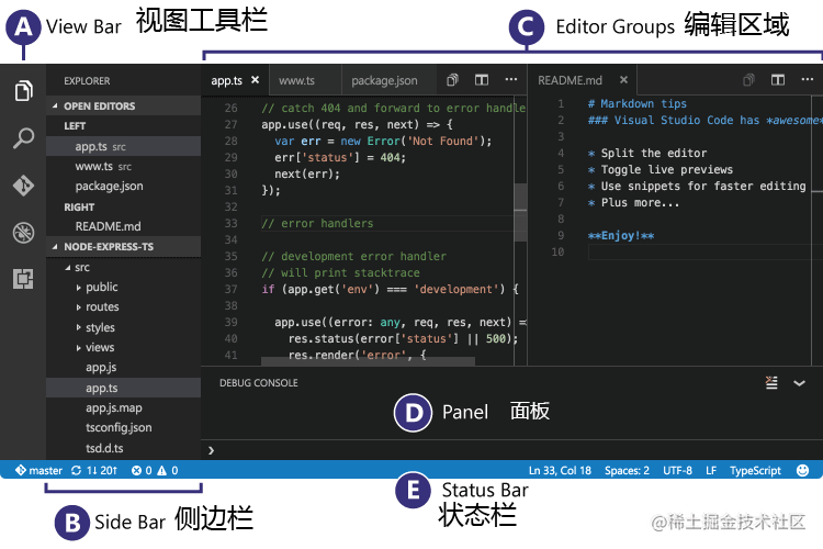 VS Code有一个简单直观的布局,它提供最大化的编辑空间,同时留下足够空间来浏览和访问你的文件夹或项目全部上下文。它的用户界面分为五个方面: