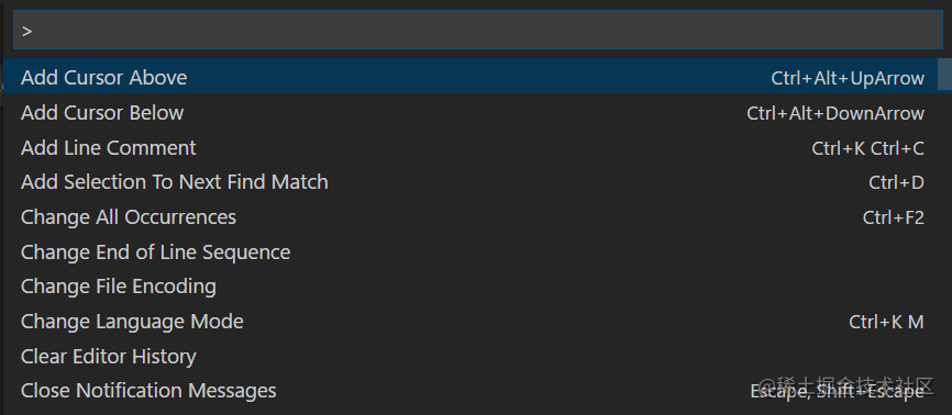 ,这将调出命令面板。从这里,你可以访问VS Code所有的功能,包含快捷键最常见的操作。