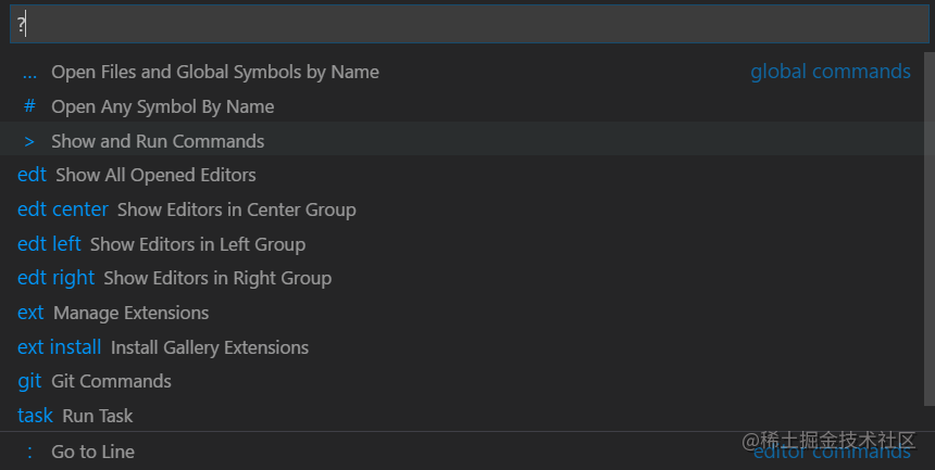 命令面板提供了许多命令。你可以执行编辑命令,打开文件,搜索符号,查看一个文件的简要概要,使用同一个交互的窗口。