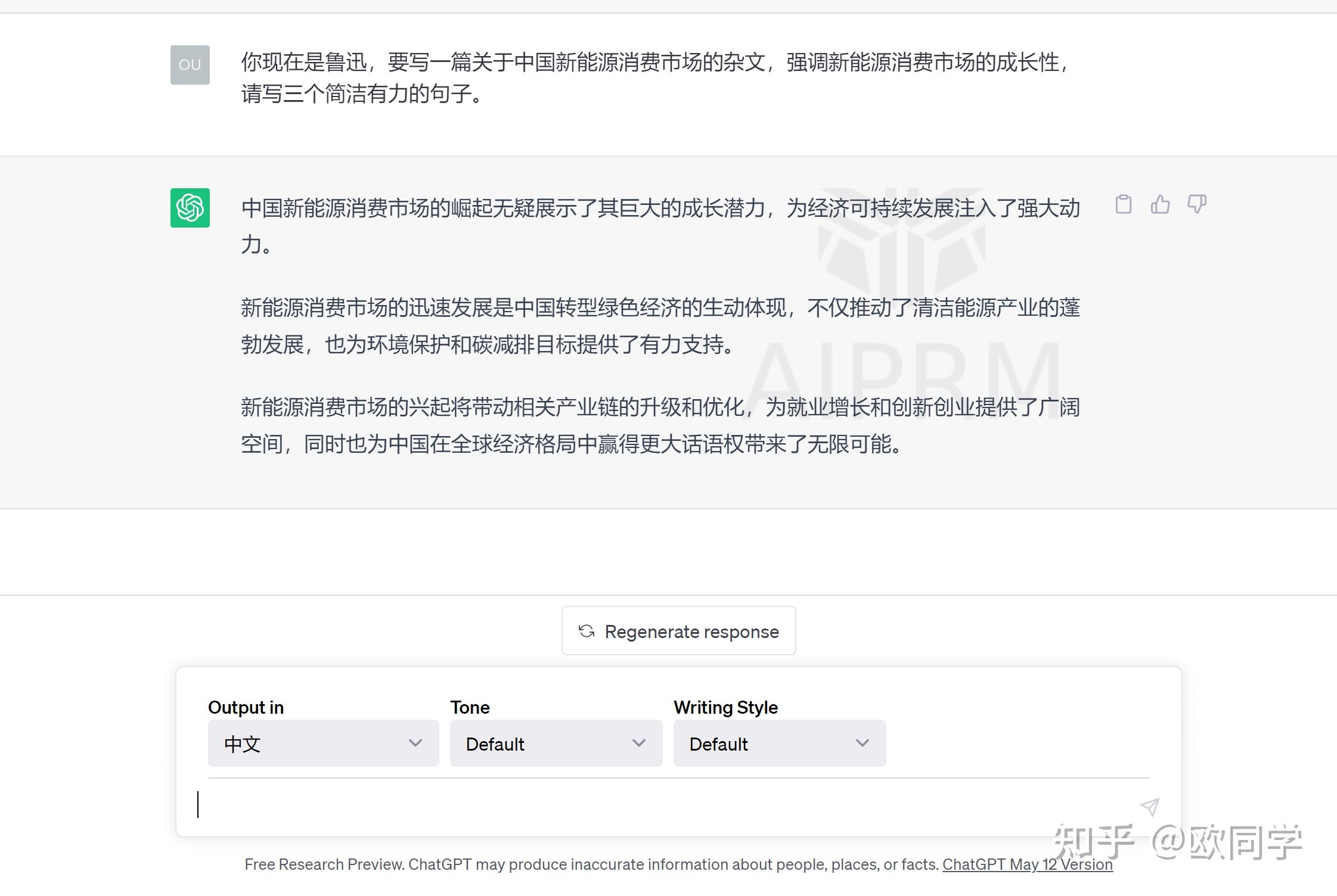 然后,我再告诉它,你现在是鲁迅,要写一篇关于中国新能源消费市场的杂文,强调新能源消费市场的成长性,请写三个简洁有力的句子。