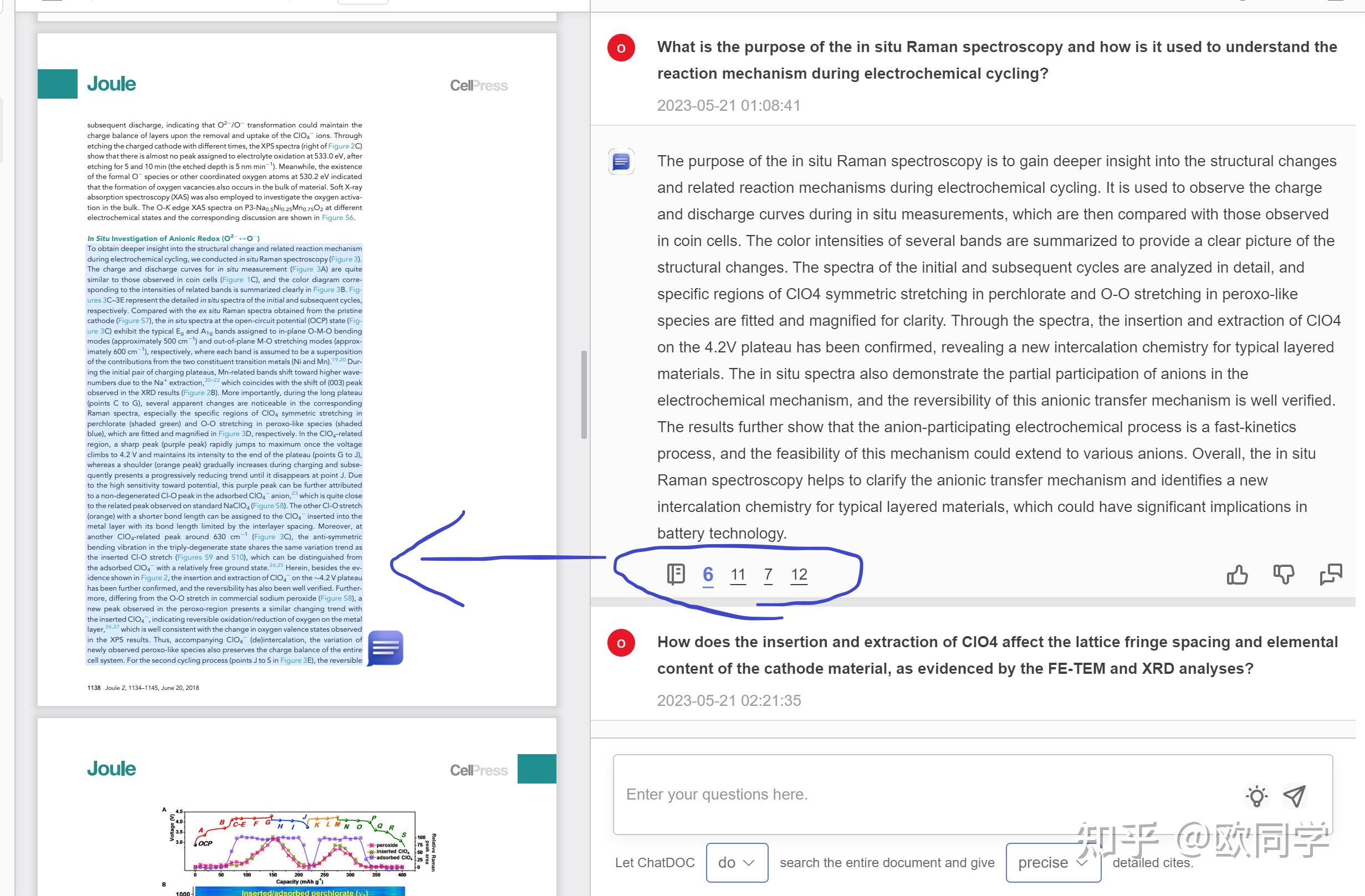 它同样可以按照chatDOC自动生成的问题去提问,也可以自己总结问题去提问。它无法搜索报告,但有个很好的特点是,在回答问题时会标注来源,指示回答来自原报告的哪个部分。你可以看到左边页面会跳转到相应位置(如下图,点击回答下面的6,原文区域就会跳到原文出处)。虽然大多数人对人工智能的回答持谨慎态度,但它提供了答案来源,方便核实,至少让我放心一些。