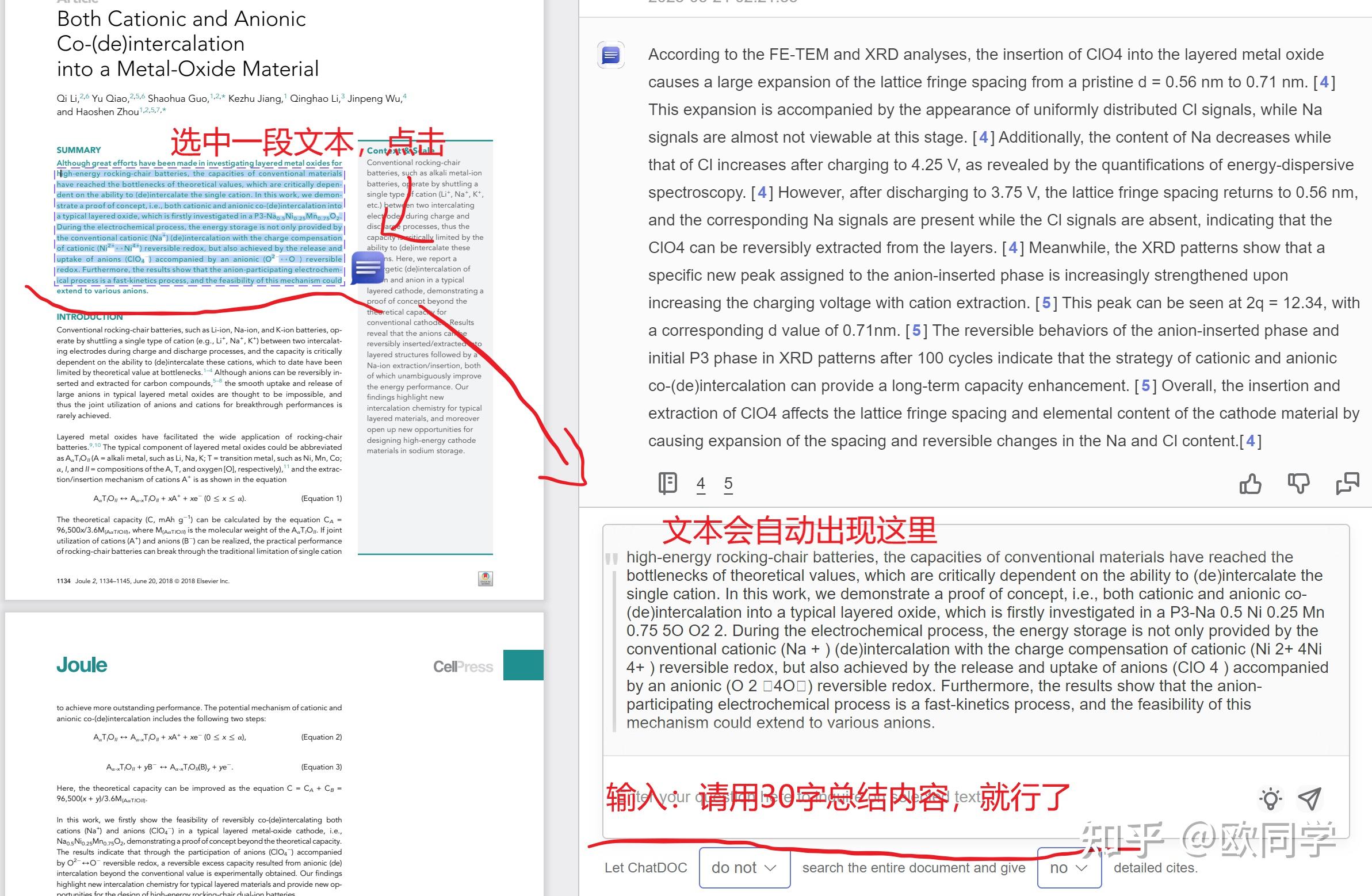 正如我们刚才提到的,ChatDOC就具备总结的功能。它不仅可以总结整篇文章,还可以总结特定段落。在使用时,我的经验是限制总结的字数,例如限制在30个字以内,否则它很可能总结得太长。
