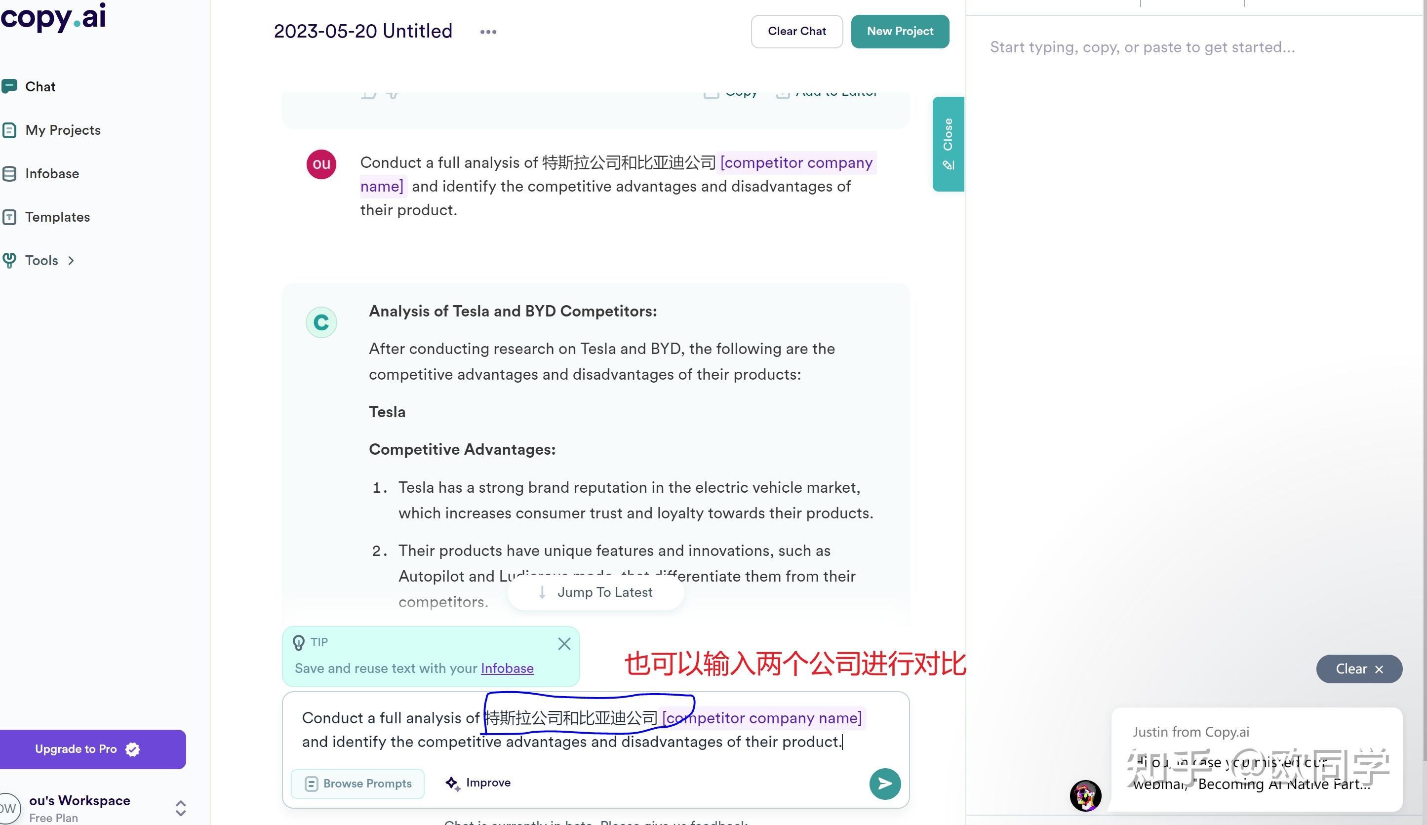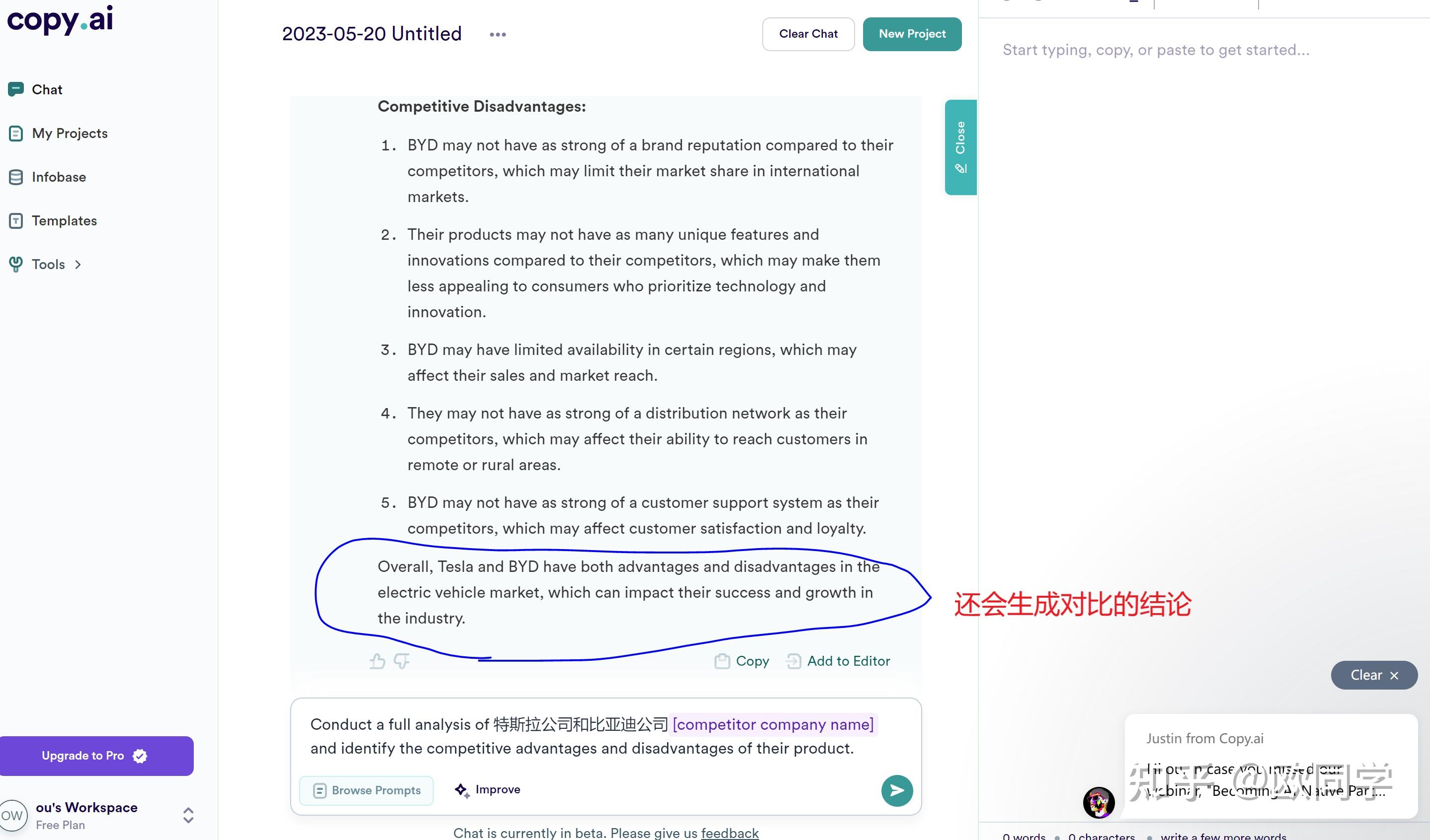 我们还可以在这里进行两家公司的对比。例如,在这里输入“特斯拉公司和比亚迪公司”。你可以看到输出的结构与刚才的类似,都是分析每家公司的优势和劣势,只是多了两家公司之间的对比。