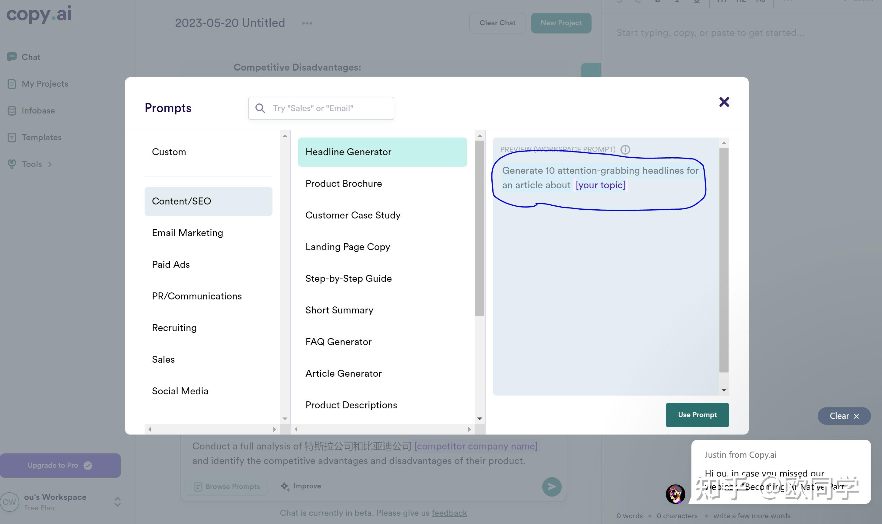 在我们有了内容,有了总结后,还需要一个吸引人眼球的标题。前面已经介绍了copy.ai这个工具,它的功能很多其中一个就是能帮你起一个抓人眼球的标题。