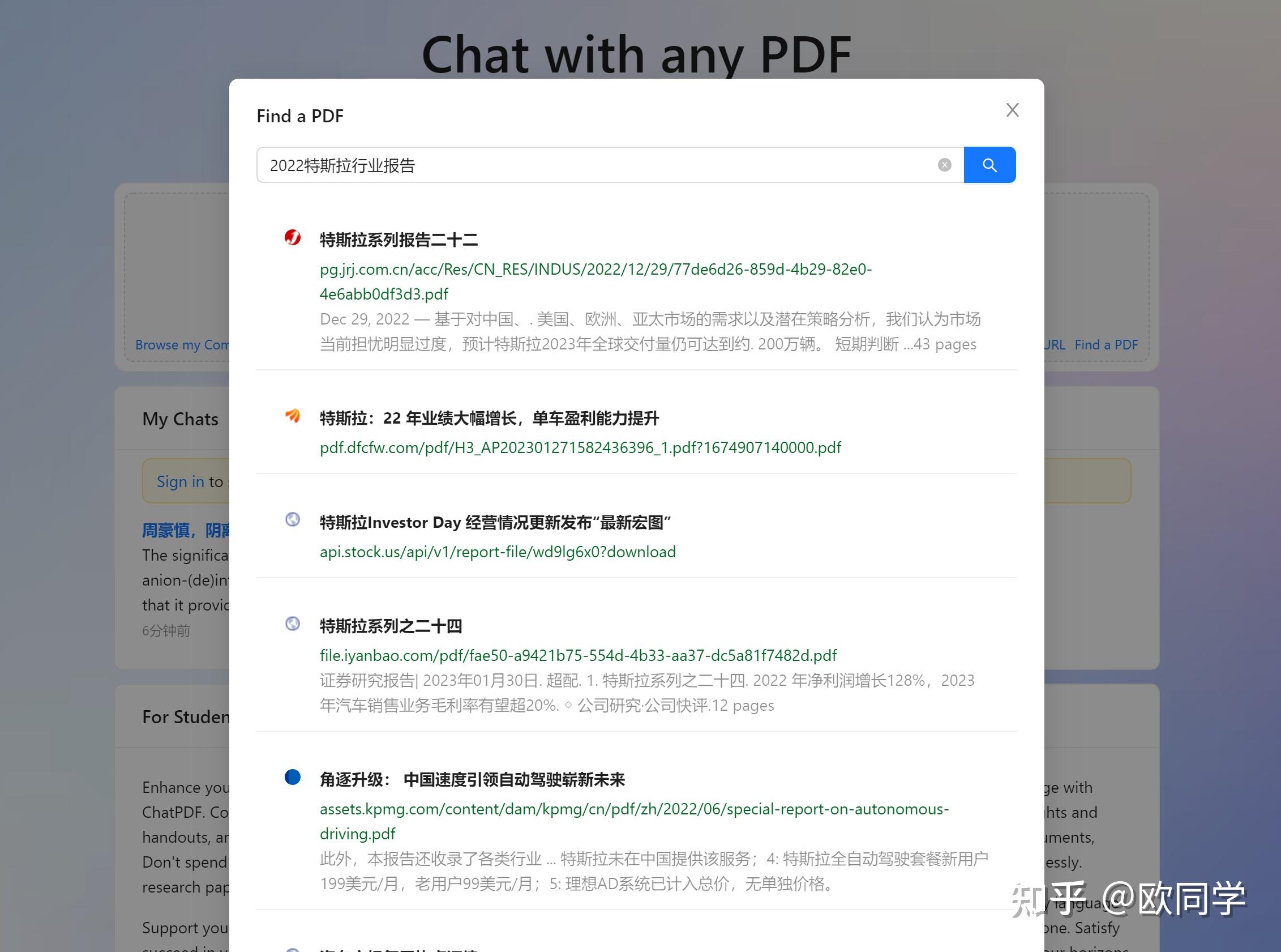 这里我再介绍一个ChatPDF的实用功能。在主页上,你可以直接搜索报告。例如,我们搜索“2022特斯拉行业报告”。它能直接调取相应报告并显示在网页上。点击报告标题可进入刚才的分析界面,点击标题下方的链接可查看报告原文。它就像一个报告搜索引擎。