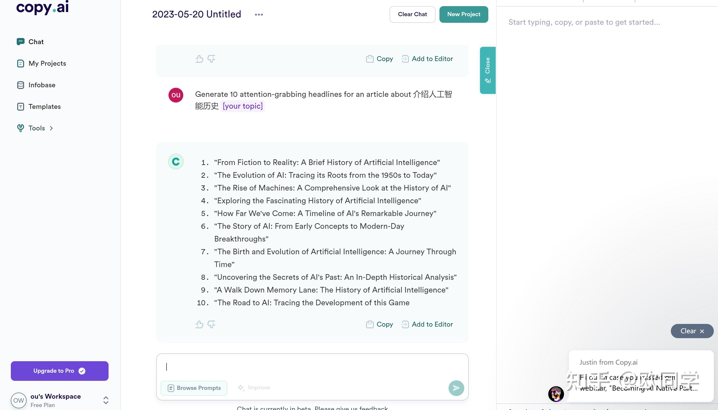 我演示一下。打开copy.ai,在对话框内选择“浏览提示”,点击“Conten/SEO”,找到“Headline Generator”。比如我输入介绍人工智能历史。AI就会提供几个标题供你选择。你看看效果怎么样。copy.ai还有很多其他的功能,有兴趣的朋友可以一起研究、分享。