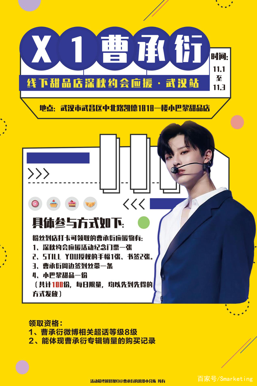 从比赛的一开始给曹承衍努力应援到现在,曹承衍的粉丝们获得了“浪漫团”的称号。近日,中国浪漫团的部分粉丝在武汉为曹承衍举办了一场线下应援活动,并且命名为“深秋约会”,邀请曹承衍的粉丝们到甜品店品尝甜点、领取礼品,来一次线下约会,也是相当浪漫了。