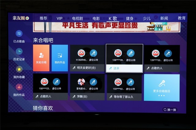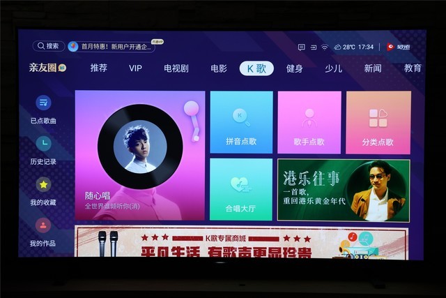 在线K歌同样是海信Hi Table系统带给我们的大惊喜,海信J70内置海量音乐资源,让我们在家也可以随时K歌;还可以在线与好友PK或合唱一首,一展歌喉的时候到了,究竟谁才是最终赢家?
