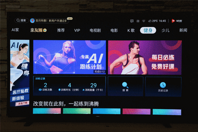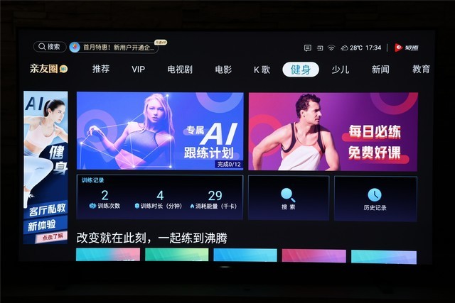 系统UI设计整体观感颇为清爽,顶部设有电影、电视剧、亲友圈、AI健身等不同的标签,以方便用户更快速查找到想要的内容,逻辑相当清晰。此外,我们在任一界面都可以通过遥控器的返回键跳转至首页,操作很方便。