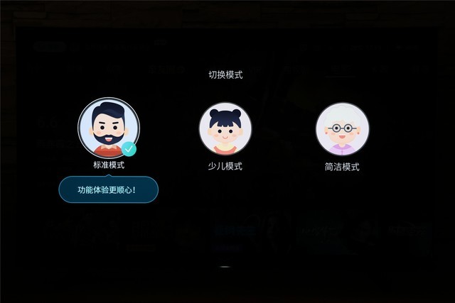 在顶部继续按向上按钮,我们可以在不同操作模式间进行切换。标准模式可以提供全面的体验,少儿模式则针对家中的儿童打造,简洁模式让操作更简单,适合家里的老人。