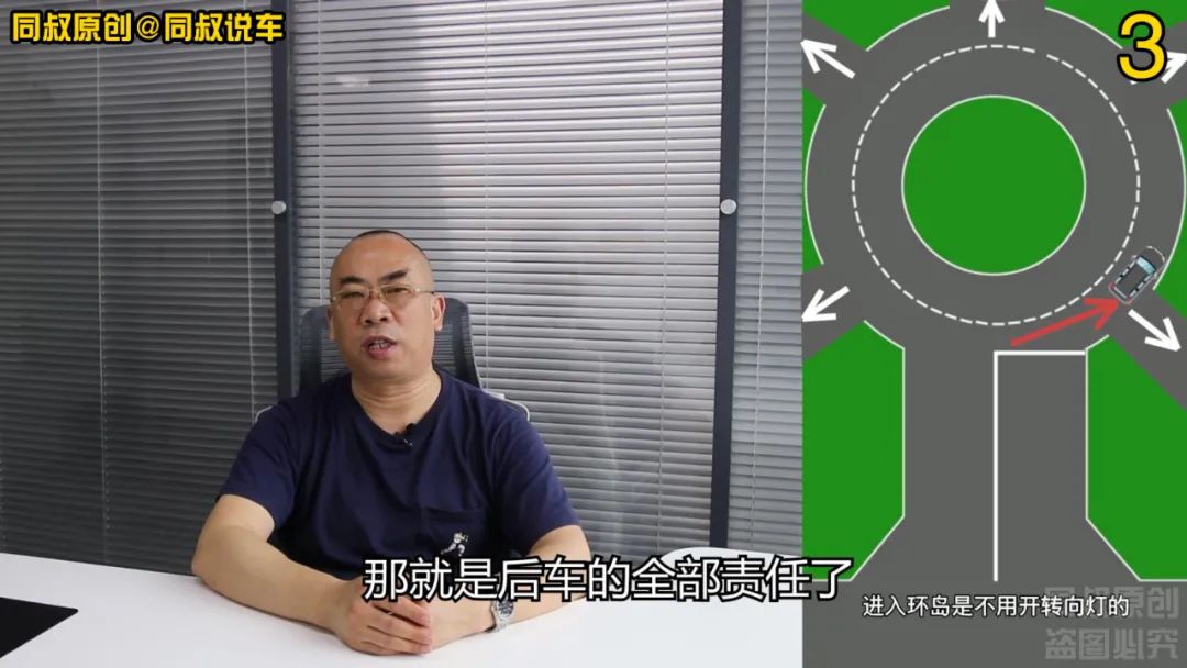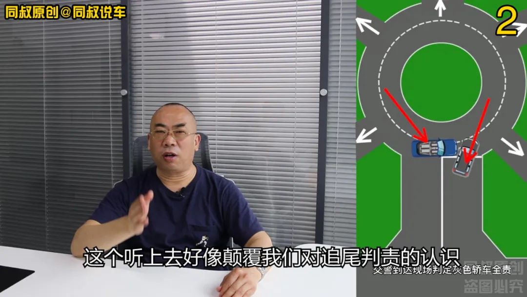 视频中灰色轿车在进入环岛时,被正在环岛行驶的车辆追尾,被判承担全部责任。这个听上去好像颠覆我们对追尾判责的认识,一般情况下,一辆正常行驶中的车辆被后车追尾,那后车要承担全部责任,那灰色轿车进入环岛行驶,难道不是在正常行驶吗?虽然进入环岛的车辆无需打转向灯,但是,环岛行驶的规则是进入环岛的车辆要给正在环岛行驶的车辆让行。也就是说,正在环岛行驶的车辆,路权要大于正在进入环岛的车辆。灰色轿车在进入环岛的过程中被追尾,应该承担全部责任。