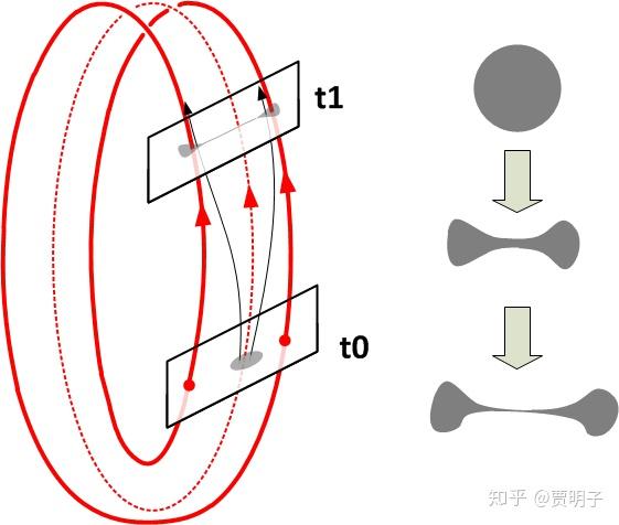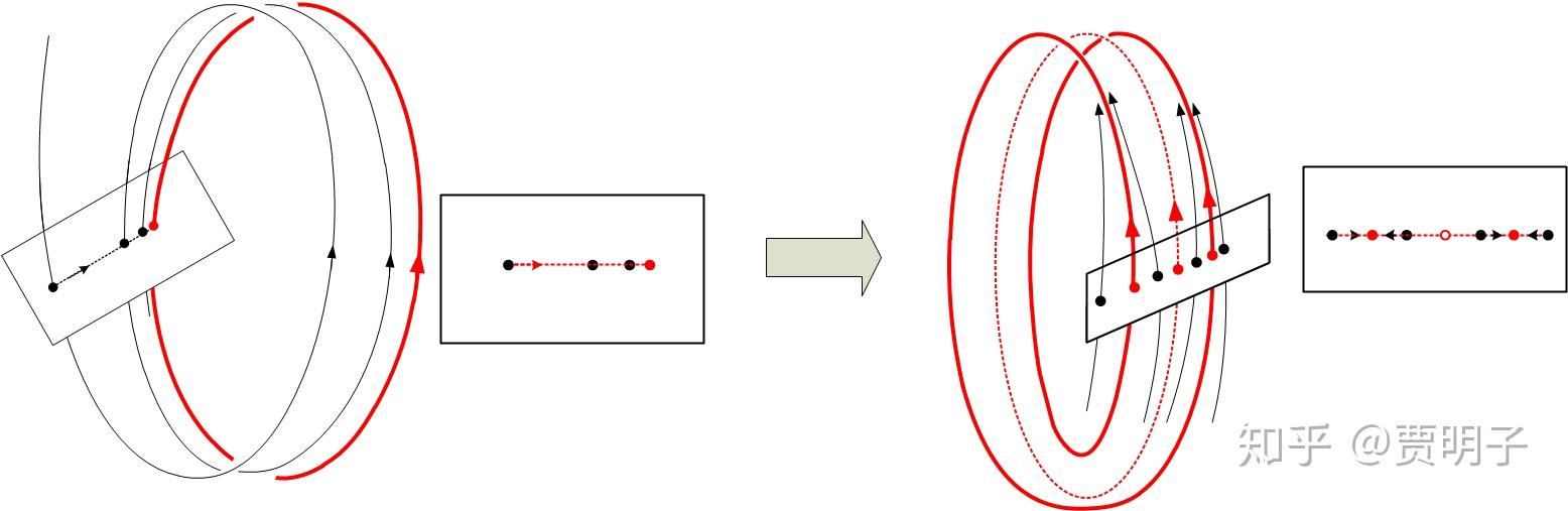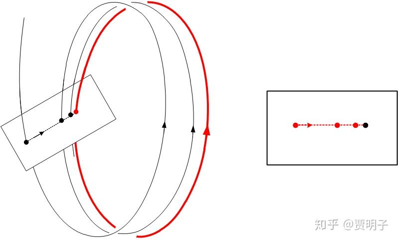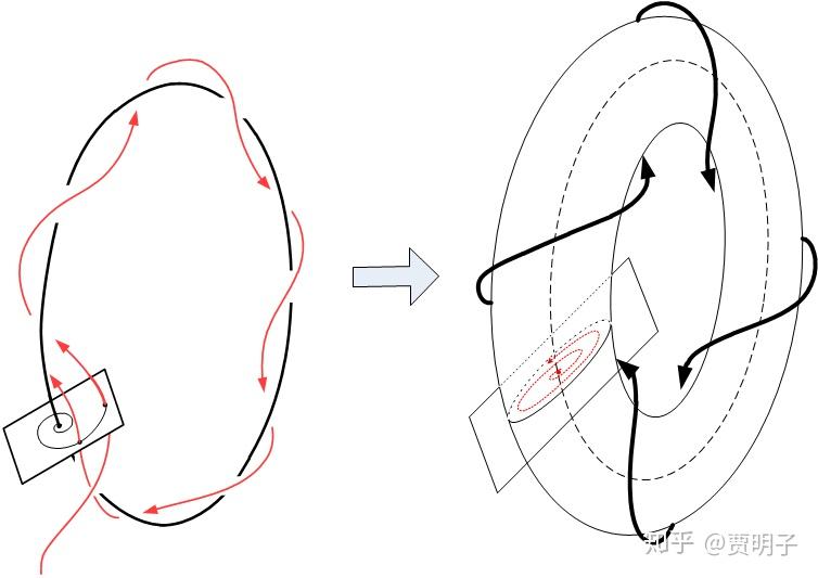 比如说下图中,红色的环是一个稳定的极限环结构。黑色的螺旋线表示某个演化轨迹。我们可以在环上面“截取”一个切面,显示轨迹每次穿过这个面所产生的离散点的变化过程。这个面叫做“庞加莱面”,而由轨迹产生交点的过程叫做“庞加莱映射”。
