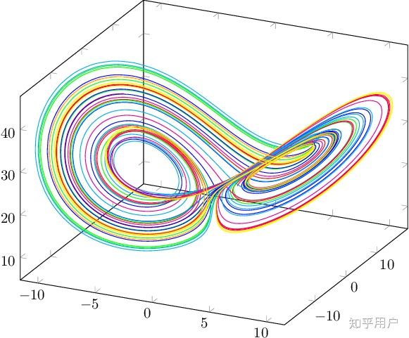 上图为 非线性系统洛仑兹吸引子 \begin{align*} \dot{x} &= \sigma(y-x) \\ \dot{y} &= x(\rho-z)-y \\ \dot{z} &= xy-\beta z \end{align*} (三维)状态量随时间运动图。每条颜色的线为不同初始值发展成的运动路线。大家可以看到,在 原点附近,差一点点初始值,其发展变化会迥然不同 。这种效应便是 混沌 。因为这张图形状如蝴蝶,且爱德华 洛仑兹本人(气象学家,洛仑兹吸引子以其命名)用 “一只蝴蝶在巴西轻拍翅膀,可以导致一个月后德克萨斯州的一场龙卷风。” 来形容这种效应,所以大家也用 蝴蝶效应 来表达“差之毫厘,谬以千里”的混沌。 线性系统 则不然, 微小的初始点变化在微小的发展时间段内必然造成微小的差距 。