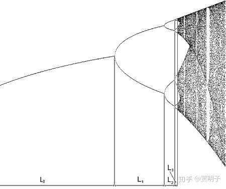 这种周期倍化的过程,最经典的就是所谓的“ logistic map ”,我们可以看到这种一分二、二分四的快速倍化过程,以及每次倍化之间的间隔越来越小(图片来自维基百科):