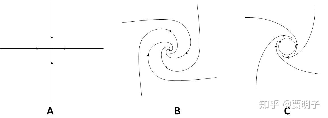 从动力学上我们可以这样解释这三张相图。A图中轨迹汇集到一个不动点,讲的是系统直接演化到一个稳态;B图中轨迹以螺旋线汇集到一个不动点,讲的是系统震荡收敛于一个稳态;C图中出现一个圆环结构,讲的是系统收敛于一个稳定的震荡。A和B的运动“大致”是一致的,它们都会收敛于一个稳态,但是C不同,C最终收敛于一个震荡。