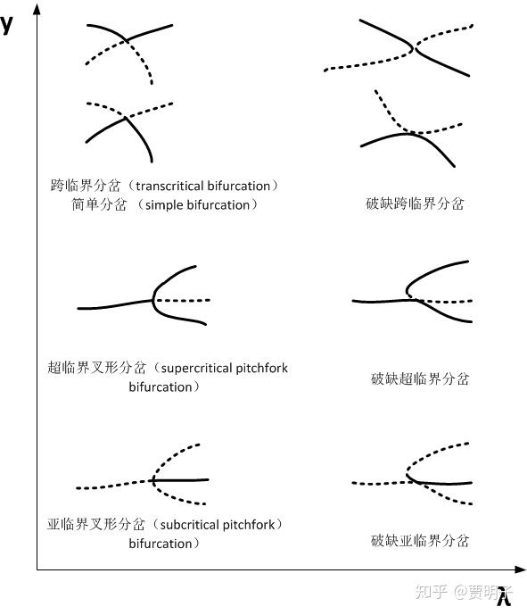 为了直观,我们在二维(y-λ)图中表示这个这个局部分岔,如下图。当然,这是一个N+1维的系统,但是我们总能选取一个y相关的数值来代替N维的y,例如y的一个分量,或者是y的一个范数。在本文中,不再区分它与y的不同。