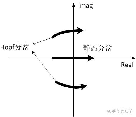 我们来讨论一下另外一类分岔,首先,我们知道,前面讨论的静态分岔的产生的原因都是因为特征值跨越零点,但是,我们还知道,特征值为复数的时候,它的实部跨越零点也会产生分岔,这就是Hopf分岔。如下图所示,特征值如果从实轴上跨越虚轴(零点),那么这就是个静态分岔,如果从其他地方跨越虚轴,那么这就是个Hopf分岔: