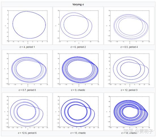 随着参数的不断变化,这种“倍化”现象会不断出现,于是从“绕两圈”变为“绕四圈”再变为“绕八圈”等等。比如说,下图是一个所谓的“ rossler吸引子 ”随着某参数的倍化过程(图形来自维基百科,rossler attractor词条):
