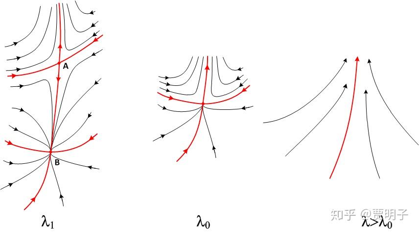 以上产生这个分岔的条件里很明确地表明,这是一个实数特征值跨越零点时的行为,并且不存在二阶奇异性,也不存在对参数偏导的奇异性。如图所示,当λ<λ0 时,系统存在两个不动点A和B,其中A在相图中表现为一个鞍点,而B表现为一个结点。而λ>λ0 时,系统不存在不动点。这里我才用了分岔图中的一个常规:稳定的分支用实线表示,而不稳定的分支用虚线表示。虚线部分的每一个点都是鞍点,而实线部分对应的是稳定结点。在上图中对于每一个小于λ0的系统,相图中都同时存在一个鞍点和一个结点。这个系统在相空间中结构随着参数的变化可以大致表现如下: