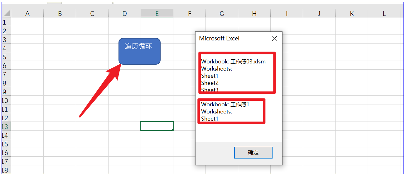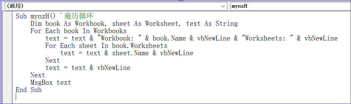 下面代码中,我们将利用“For Each...Next”语句遍历所有打开的工作薄和每个工作薄的工作表的名称。