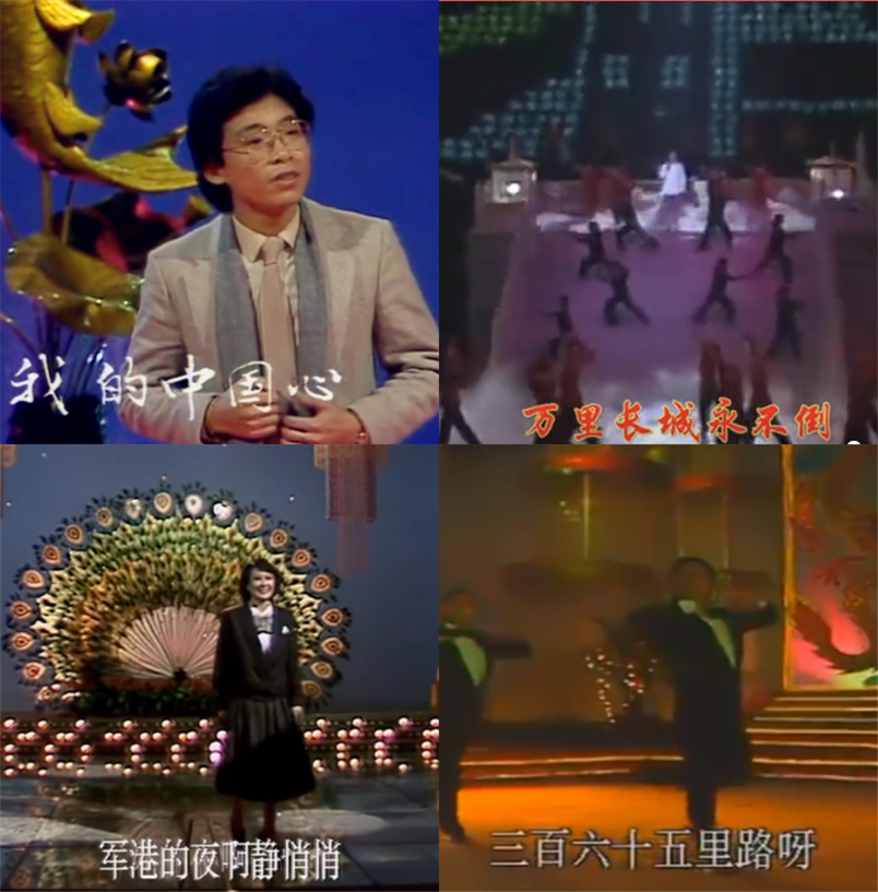 80年代,无数港台爱国歌曲在这特殊的舞台得到广泛传唱,1984年张明敏的《我的中国心》、1985年的《万里长城永不倒》、1986年的《军港之夜》、1988年的《三百六十五里路》等等,都在诚挚的歌声中表现家庭期盼团圆、游子思念故乡的温情时刻。