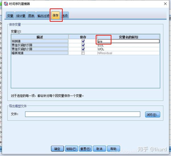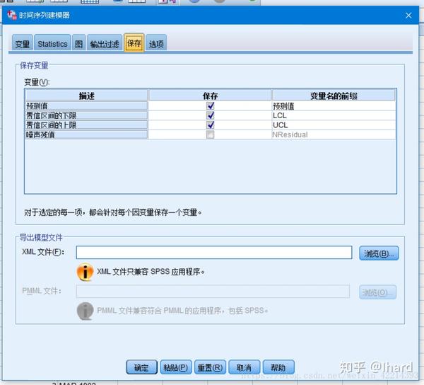 假如要预测此超市未来12个月的销售额,首先在时间序列建模器的保存选项中将'预测值'和置信区间打钩(置信度95%),导出模型文件这里可以保存预测模型,如图