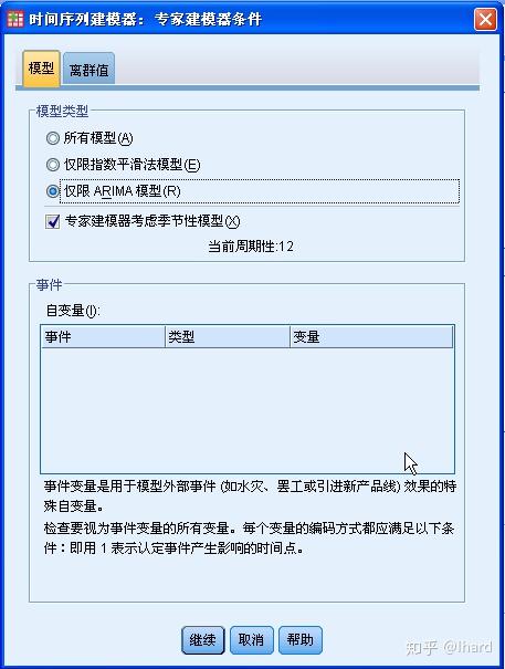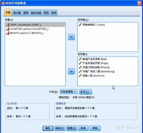 注意:使用专家建模器时,只有在自变量与因变量之间具有统计显著性关系时才会包括自变量。如果选择ARIMA模型,“变量”选项卡上指定的所有自变量(预测变量)都包括在该模型中,这点与使用专家建模器相反。