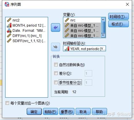 对比一下原始序列和预测值效果,将原始序列和预测值及置信区间变量放入选项框内