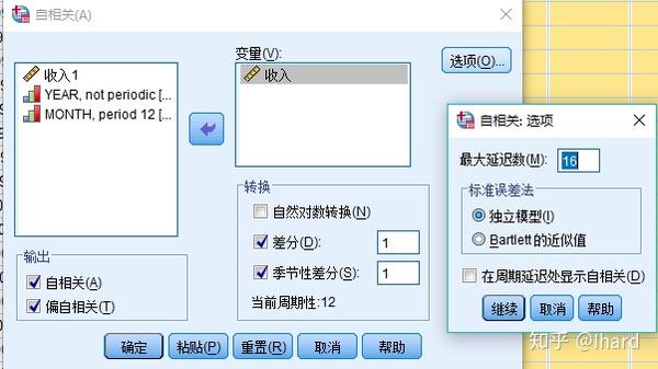 单击选项以设置最大延迟数或计算标准误差的方法,或仅在季节性延迟位置显示自相关。
