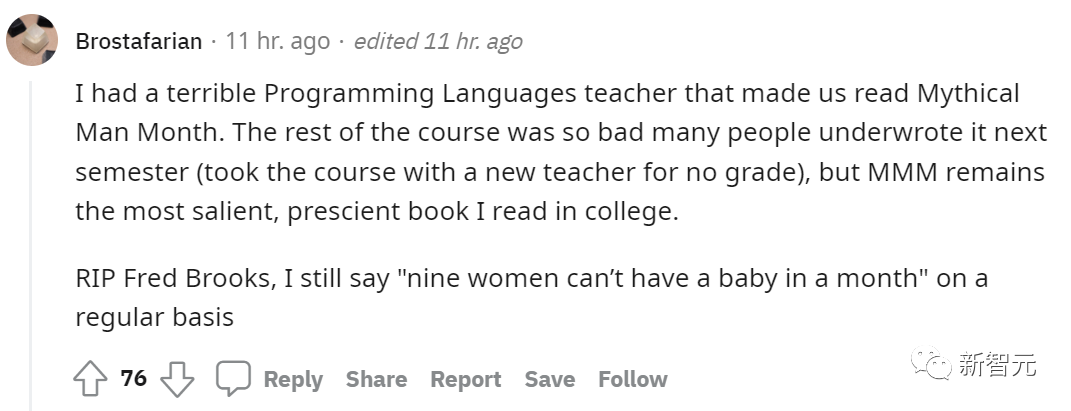 难怪在Reddit上,有人称《人月神话》是所有软件工程师的必读书目后,网友回复道:「看上去这本『必读书目』也是『必忘书目』。Brooks提到的经验教训,我们什么时候才能真正学到呢?」