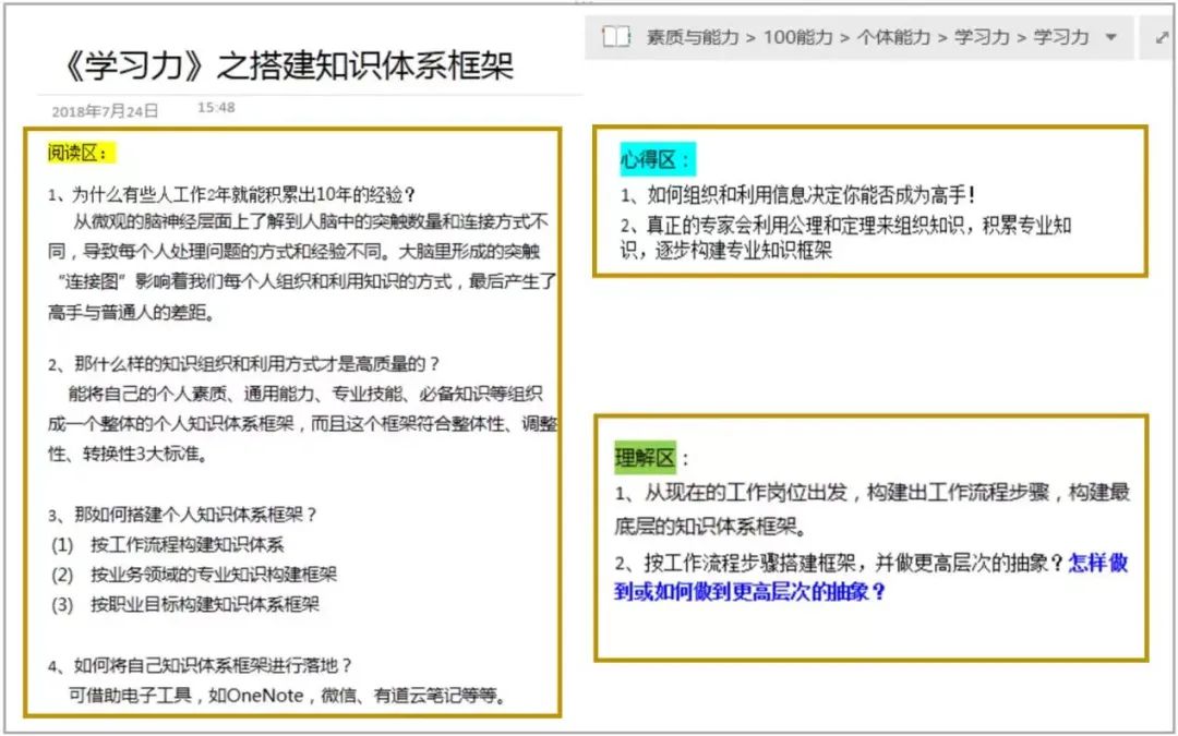 如上图所示,将笔记页面分为三个区域——阅读区、理解区和心得区。