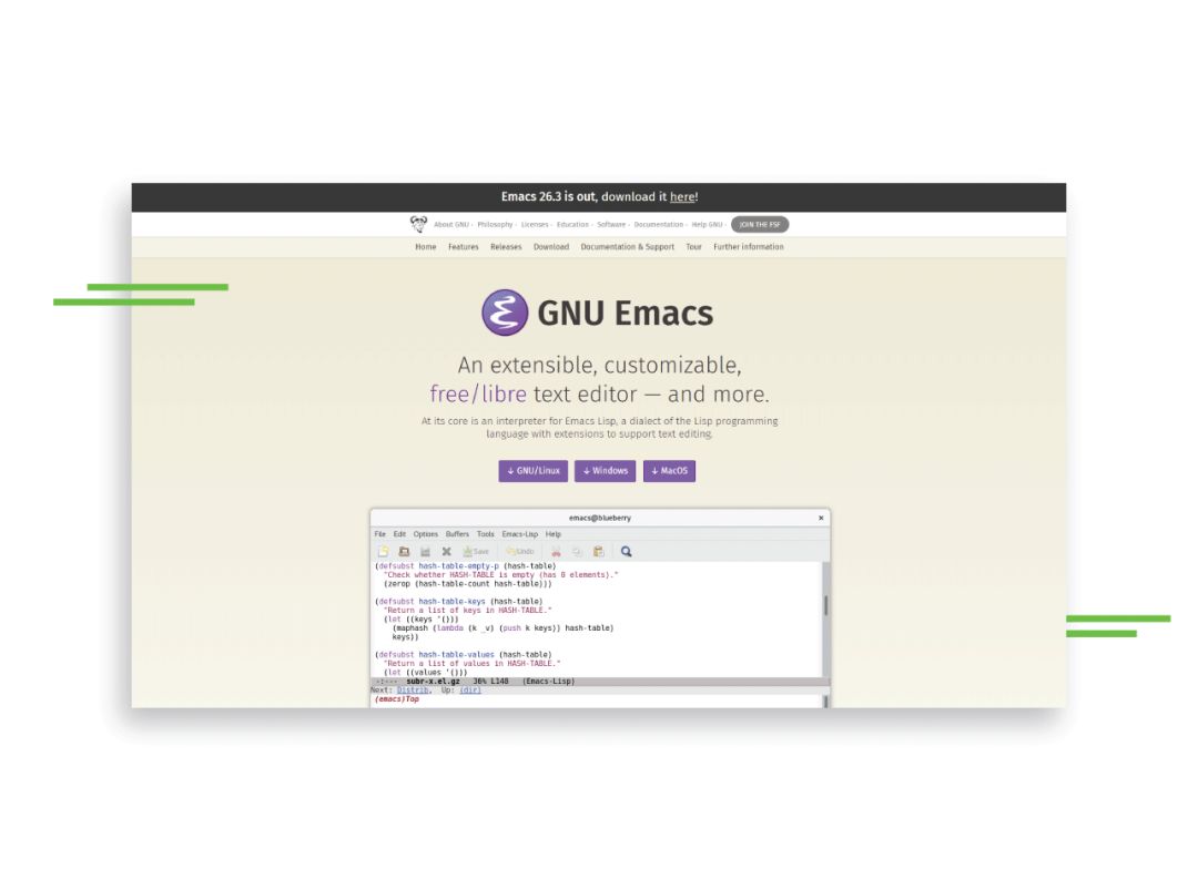 GNU Emacs 也是最好 Python 编辑器的有力竞争者。它常被描述为可扩展、自文档化、实时显示。尽管它在业界并非最新,但它经常升级来满足开发者的需求。