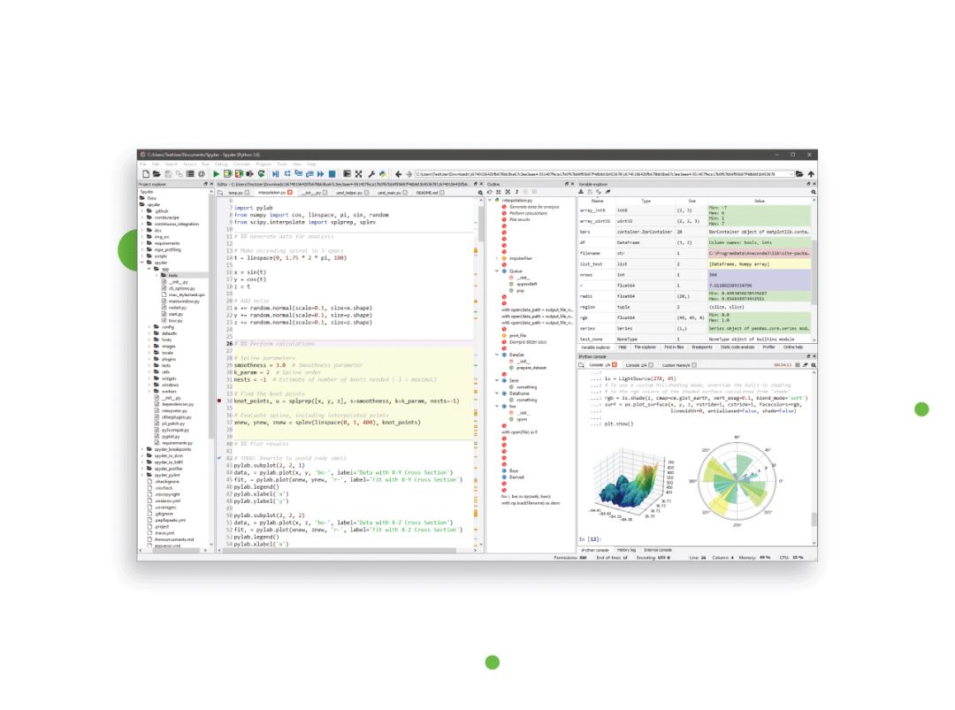 Spyder 是为数据科学而开发的。它是开源工具,能够与大量平台兼容,因而成为 IDE 新手用户的更好选择。为实现完美开发,它合并了多个关键库,如 NumPy、Matplotlib 和 SciPy。