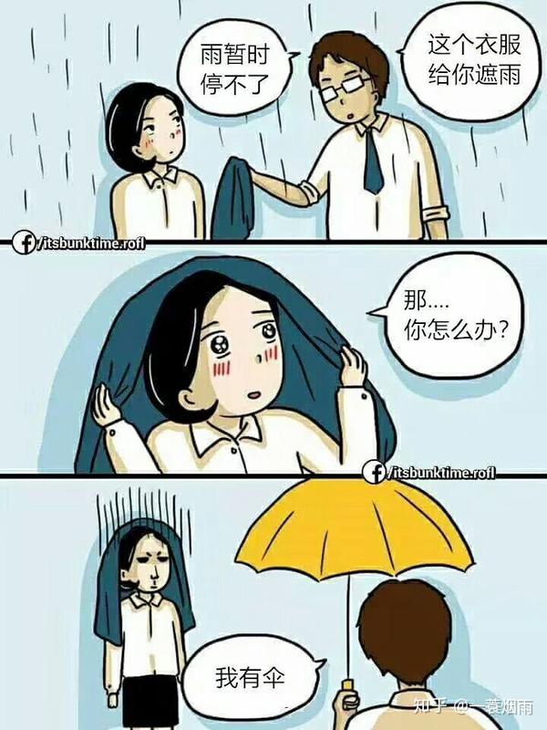 前两幅图女生都感动了,为何最后会黑脸?是期望没有达到,本以为衣服已经是男生的全部关心,一个男生可以为我委屈、甚至牺牲他自己,即使只是一件衣服,也会令女生感动得一塌糊涂,“如果他的想法跟我一样,我愿意跟他过一辈子!”因为男生把他的全部都给了女生了,很多时候,女生看中的并不是对方多有钱,关键还是对方的态度。出现后面那种情况,女生黑脸然后谢谢,黑脸只是期望落空,谢谢是记得你的衣服,洗好送还,下次如果男生遇到这种情况,女生借他一把伞,算是还了,也就这样了。