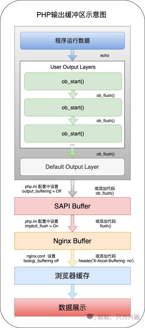 PHP-FPM 实现了 SAPI 接口,PHP 默认缓冲区输出的内容会被 PHP-FPM 进程缓存。