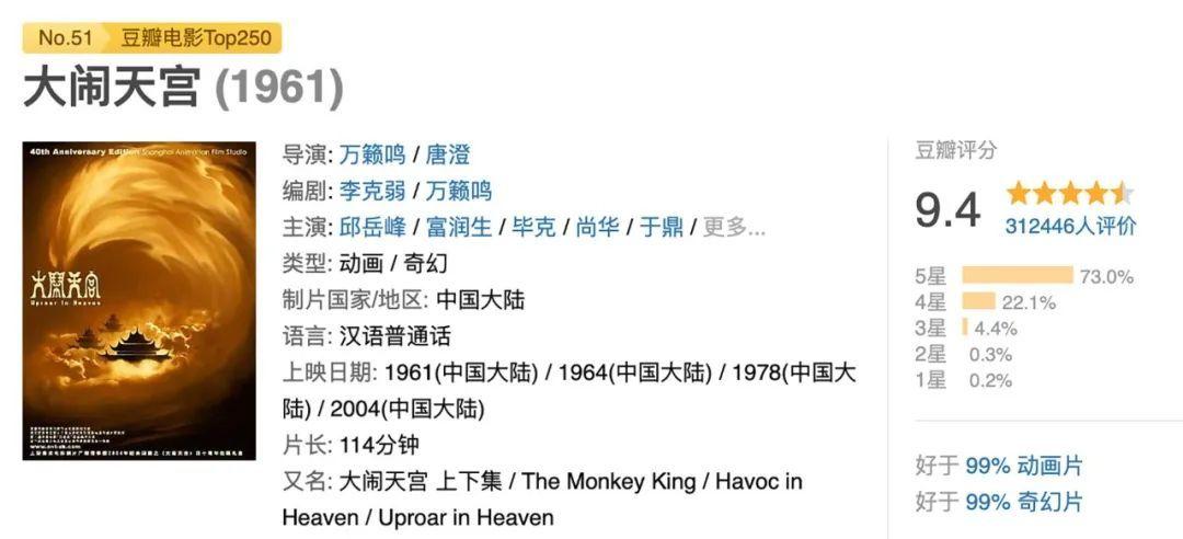 ”直到今天,网友们依然在不断重刷这部动画片,豆瓣上,31万人打出了9.4的高分。美猴王的形象成了几代人的共同童年回忆。