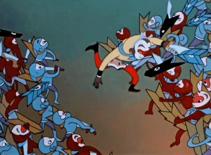 《大闹天宫》是中国第一部彩色动画长片。“中国动画难以逾越的一部。”“真纯粹的中国动画。”“这个腰间束着豹皮裙,手舞金箍棒,神采奕奕,勇猛矫健的猴王成了人们心目中永远的孙悟空形象。