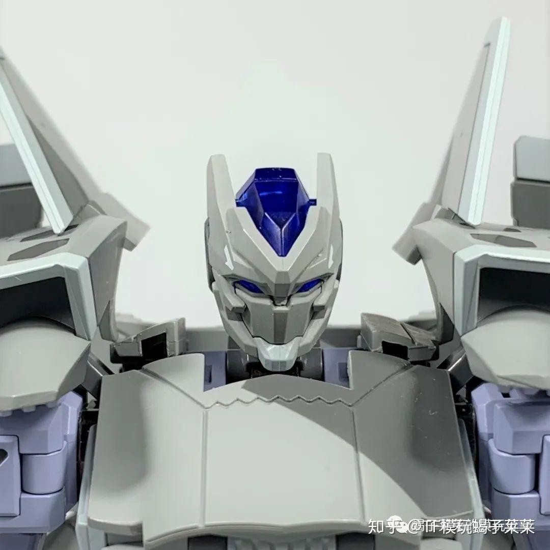 头雕,总体来说,比较丑。蓝色的透光件效果不错,不过覆盖面过大导致整体显得有些廉价;面相稍邪,没有主角机的样子,个人猜测可能也与下颚前凸以及缺少天线有关....