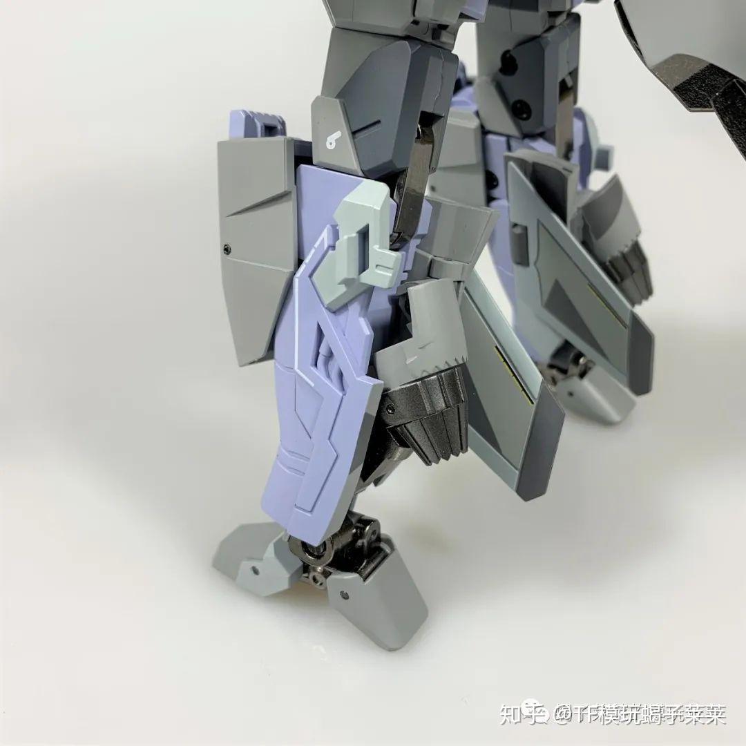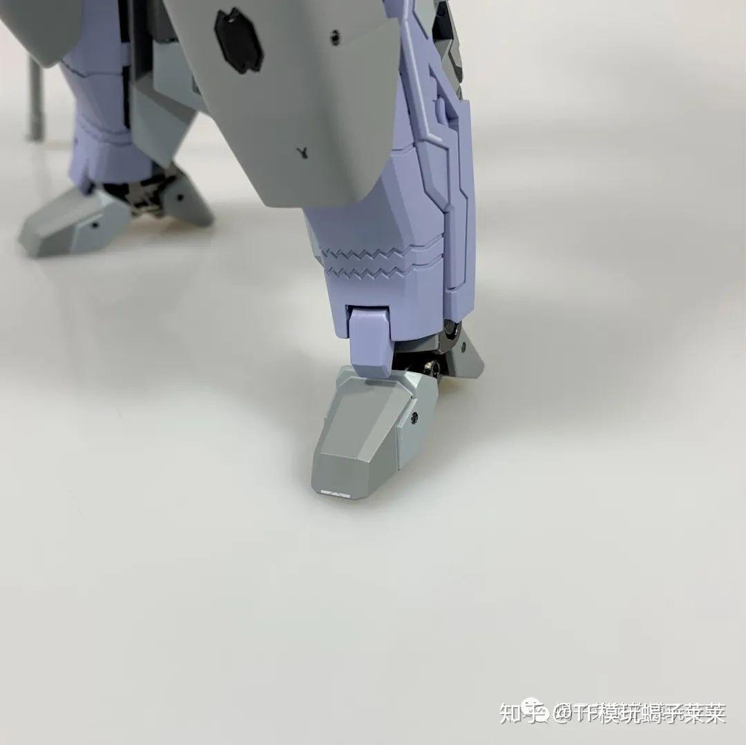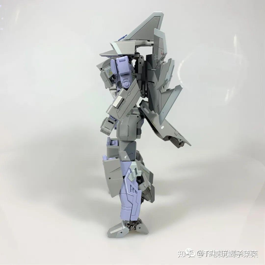 侧面能够更清楚地看到背包的折叠方式,厚度尚可接受,另外,背包下方缺少卡扣增加机翼折叠之后的稳定型,只能可以依靠关节紧实度去固定造型;后裙甲造型与设定图有出入。小腿后方的喷口造型个人比较喜欢,不过内侧有暴露小部分空洞,要是内侧的尾翼能调换到外侧就完美了。脚掌偏小,不过能保持站立性,得益于整体合金部件的使用以及关节紧实度。