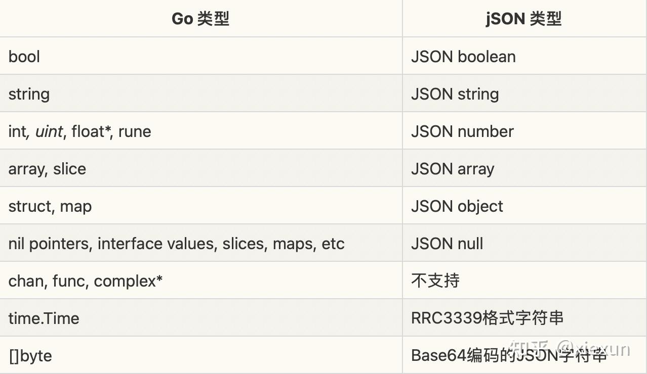 下表总结了不同的Go类型在编码过程中是如何映射到JSON数据类型的: