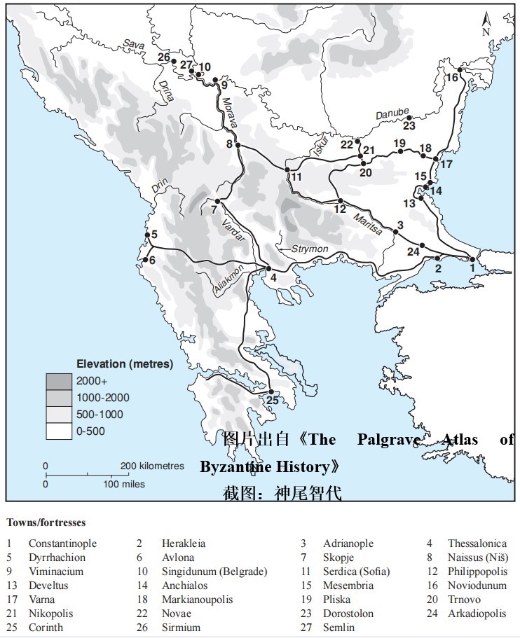 Map 1.9 The Balkans: major routes, 7th–12th centuries. 巴尔干半岛:主要路线,7-12世纪。