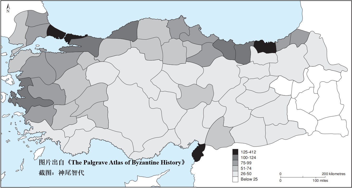 鉴于上述的地理限制,显然,定居的模式,特别是定居的密度,将非常密切地反映这种环境,这在现代以及前现代和前工业化世界中确实是这样。将罗马末年和拜占庭早期世界的城市(根据罗马法律背景定义)所反映的定居密度地区与显示现代人口模式的地区进行比较,可以显示出巴尔干和安纳托利亚的连续性。当然,这样的地图不能提供一个绝对的数字,也不能告诉我们定居的密度和范围在不同时期的波动情况;但它确实指出了人口与土地承载力之间的关系。只要看一眼土耳其在第二次世界大战前(代表1930年代中期)的人口状况,就可以很清楚地看到这种关系(地图1.8)。一张显示罗马城市和拜占庭主教区密度的地图突出了这样一个事实:在古代和中世纪能够维持大量人口的地区或多或少都是城市中心最密集的地区;因此可以认为,在7世纪以后的古代后期城市网络转型之后,这些地区仍然是拜占庭时期生产力最强、定居人口最多的地区。考虑到工业化和工业与农业生产机械化带来的变化,将罗马和中世纪的人口中心与巴尔干地区的现代人口集中地进行比较,也会出现了类似的模式。