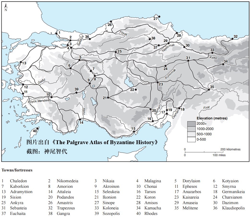Map 1.10 Asia Minor: major routes, 7th–12th centuries. 小亚细亚:主要路线,7-12世纪。