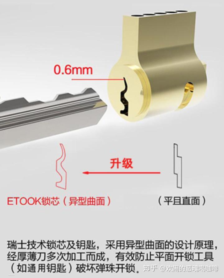 防尘罩,防电钻是基本操作。瑞士锁芯不在A - C的开锁难度评级里。但是锁芯是曲面的,而且 每个锁都是独一无二的,不会有互开钥匙 。