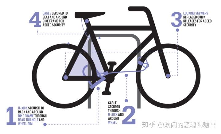 用法: 一把锁后轮,一把锁前轮和栏杆。线绳锁锁座位(如果贵的话,图中4的位置)或者连接两个轮子和车身(图中2的位置)。