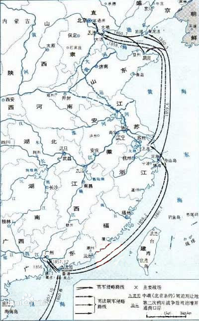 4月,英法联军占领舟山定海。随后,英法两国军队分别占领了大连湾和山东烟台作为进攻基地,同时从南北两边将渤海湾封锁起来,对大沽口形成包抄之势。