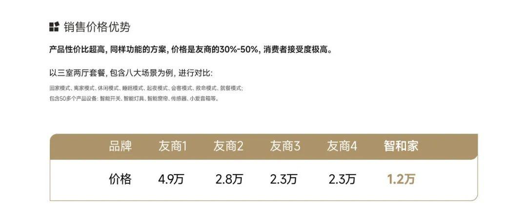还有我们销售的价格优势,我们产品性价比超高的,这一点在业内目前来说也可以说是独领风骚。 以这个三室两厅的套餐为例,我们在提供了八个主要的智能场景的情况下,同时还提供这种可调光、可调色温的将近50多个智能设备的套餐方案,我们能够做到的价格,目前来说也是非常有竞争力的。