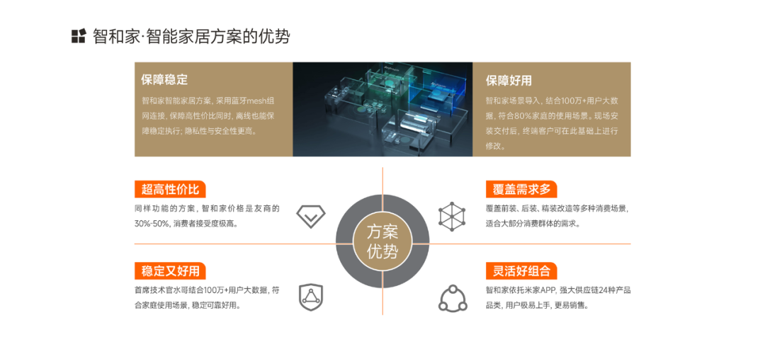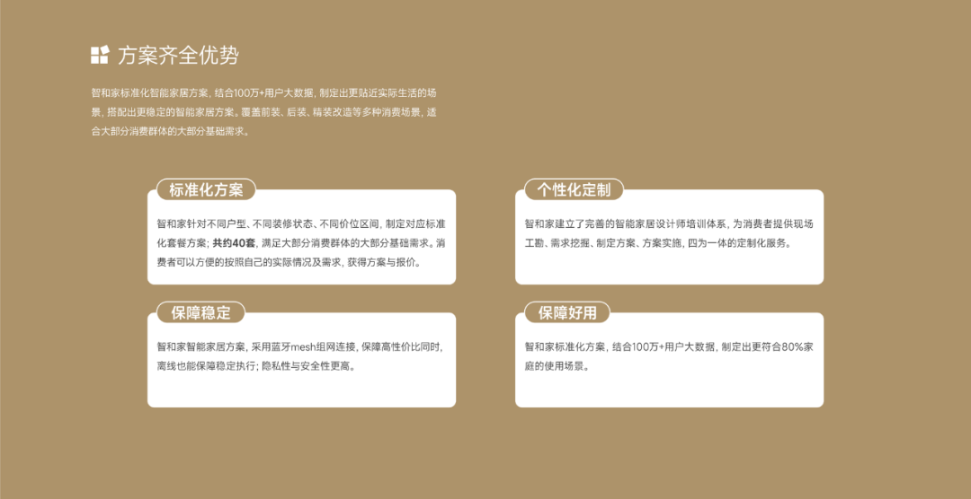 我们最大的一个优势,就是方案齐全。 主要体现在四个方面:一是我们针对不同的客群,不同的这种户型,不同层次的用户,总结出了几十套标准的方案,使得我们的服务商、加盟商能够快速的对号入座,大大的减轻他们在给客户做服务时的技术门槛;二是稳定,智能家居这种牵涉到网络的,稳定可靠性是第一位的,在这一块,我们可以说有相当大的优势;三是个性化的定制,我们针对智能家居的从业者、设计师这块,有一个完整的培训体系;最后一点,在用户体验这一块,我们结合着这些标准方案,以及从各个用户那收集到的需求,整合出来的适合80%家庭的使用场景,实用性与好用性兼备。