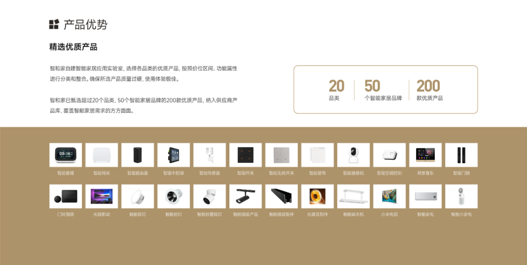 下图显示的就是我们目前在主打的全屋智能家居产品的品类以及相关的品牌,总共有将近20个品类,50个智能家居的品牌,200款产品,都是我们经过精挑细选定出来的。