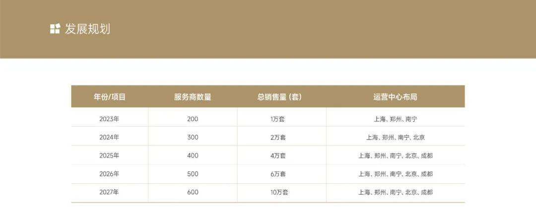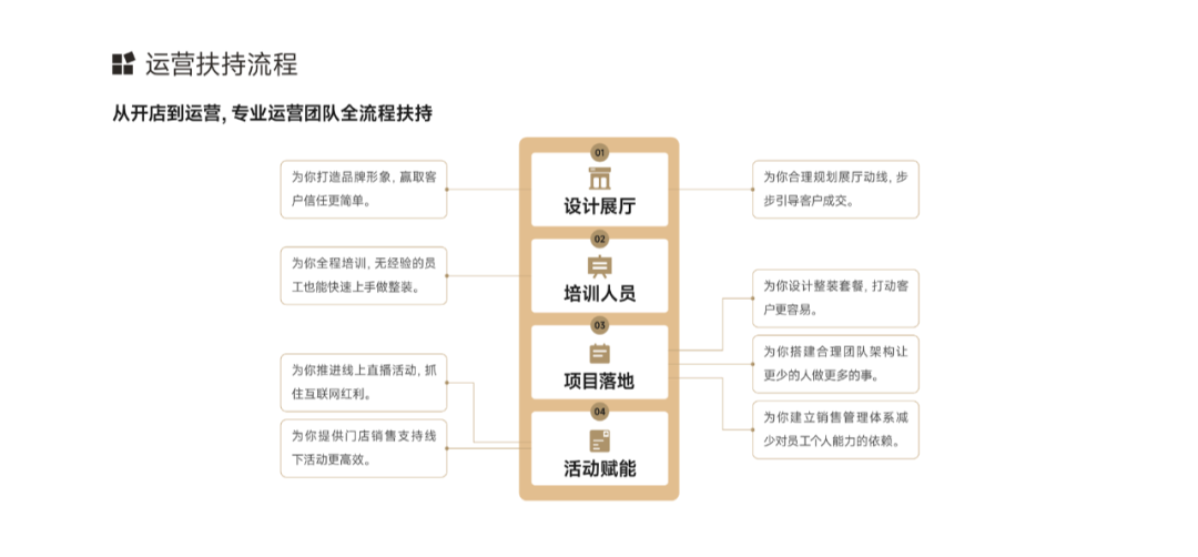 再看下面这个运营扶持流程,从设计展厅、人员培训,到第一个项目落地,以及各种销售活动赋能等,总部这边都会提供完整的扶持方案。可以这么讲,目前在智能家居行业,我们提供的整套培训体系及技术支撑是非常具体、非常到位的。